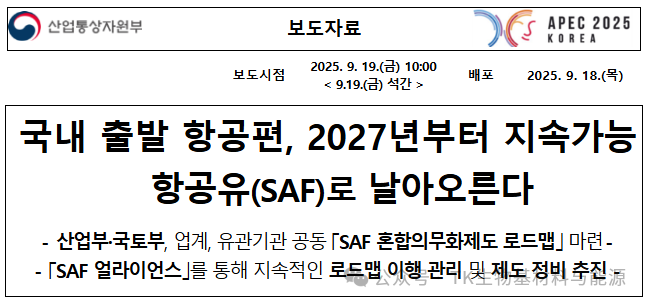 韓國強(qiáng)制:出境航班使用可持續(xù)航空燃料(SAF),從2027年起